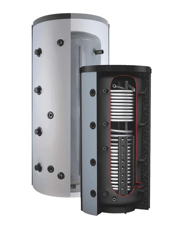 Zbiornik warstwowy KWS R2 z wbudowaną rurą karbowaną ze stali nierdzewnej do bezpośredniego przepływowego ogrzewania ciepłej wody użytkowej oraz 2 wężownicami do podłączenia instalacji solarnej i dodatkowego źródła ciepła.