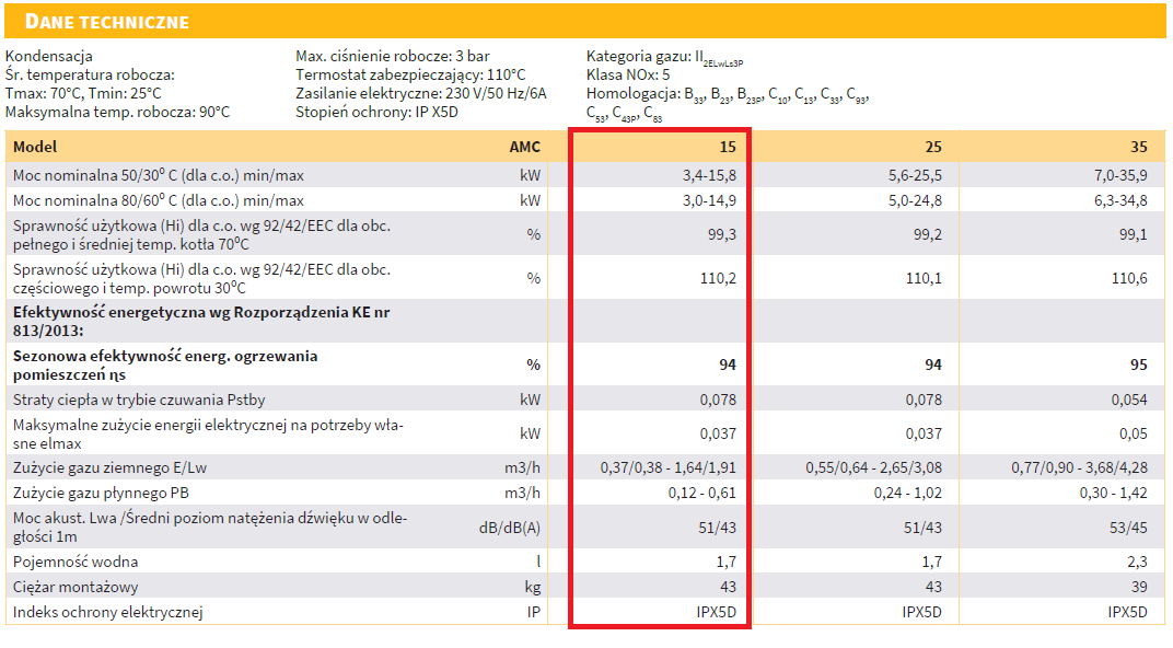 - Wyposażenie kotła: rama montażowa z zamontowanym fabrycznie zespołem zaworów wodnych i gazowych, pompa modulująca o wskaźniku energochłonności pomp EEI < 0,23, zawór przełączający c.o./c.w.u., naczynie wzbiorcze 12l (w kotle AMC 35 brak naczynia) odpowietrznik automatyczny