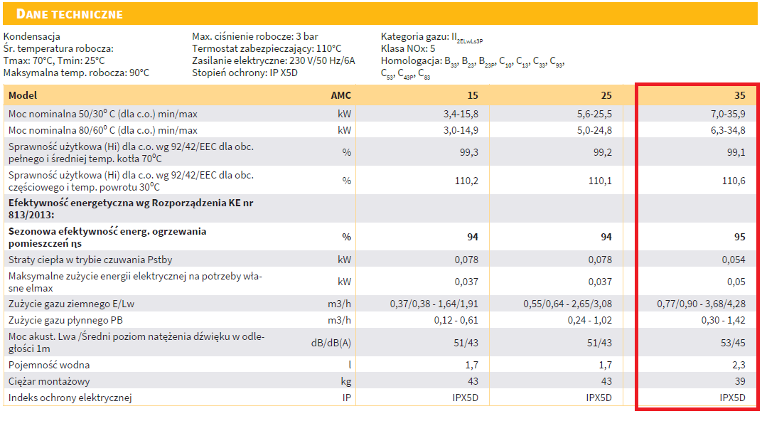 - Wyposażenie kotła: rama montażowa z zamontowanym fabrycznie zespołem zaworów wodnych i gazowych, pompa modulująca o wskaźniku energochłonności pomp EEI < 0,23, zawór przełączający c.o./c.w.u., naczynie wzbiorcze 12l (w kotle AMC 35 brak naczynia) odpowietrznik automatyczny