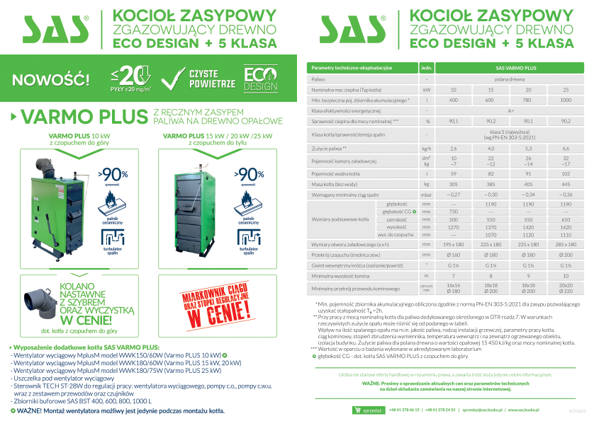 Kocioł c.o. SAS VARMO PLUS 25 kW zgazowujący drewno, A+ PM <20, 5 klasa, EcoDesign